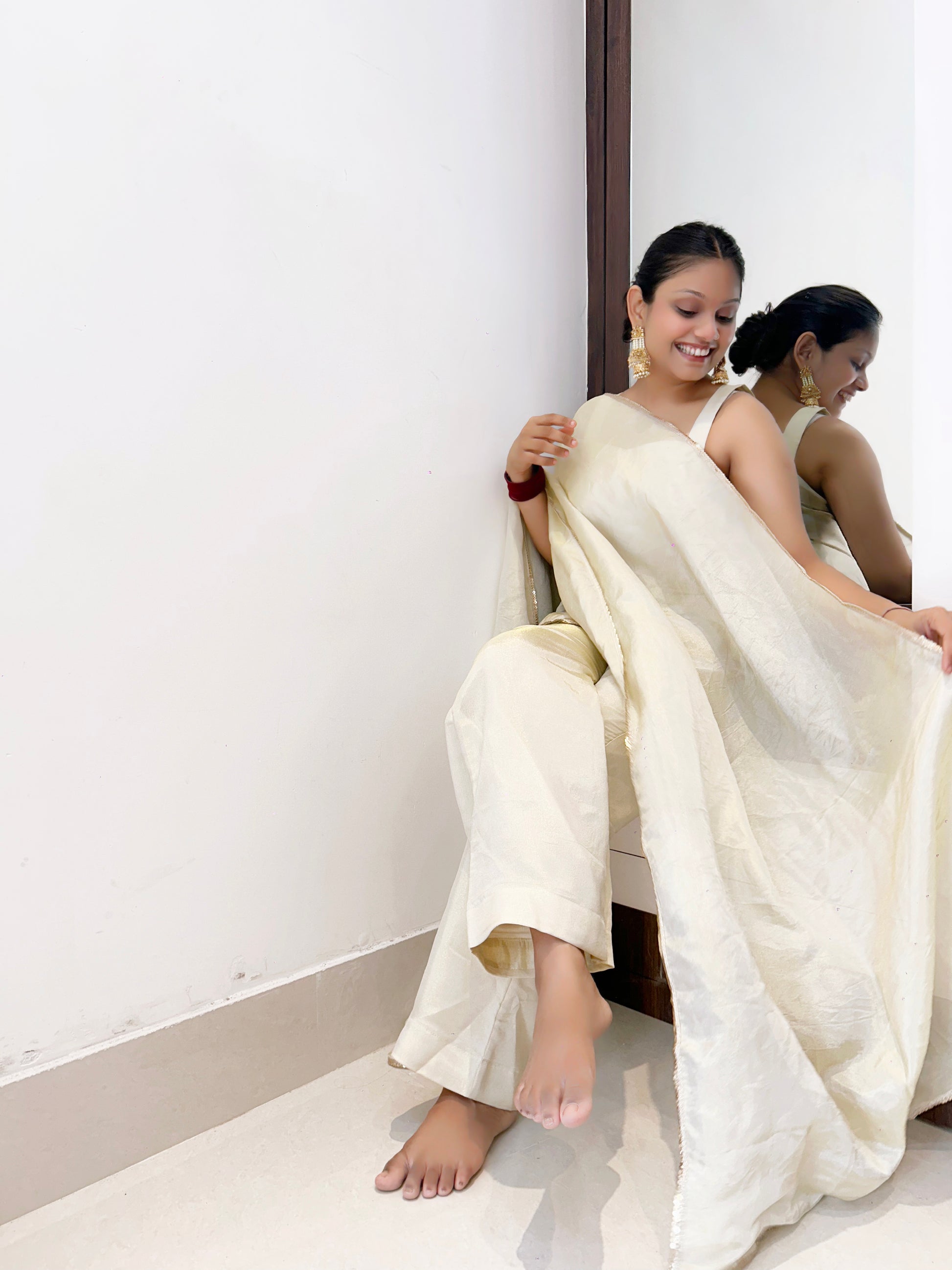 Top: Straight-cut kurta crafted in rich tissue fabric, highlighted with golden lace detailing for a subtle festive shimmer